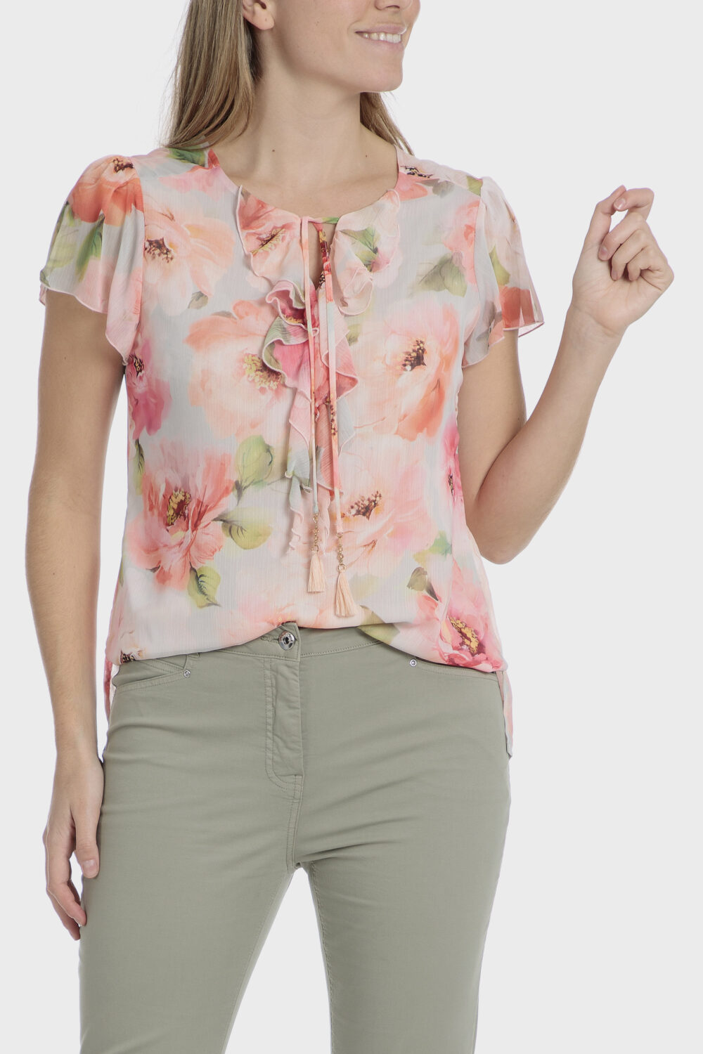 Printed shirt coral coloured v neck long sleeves with elastic cuffs front buttoned closing.