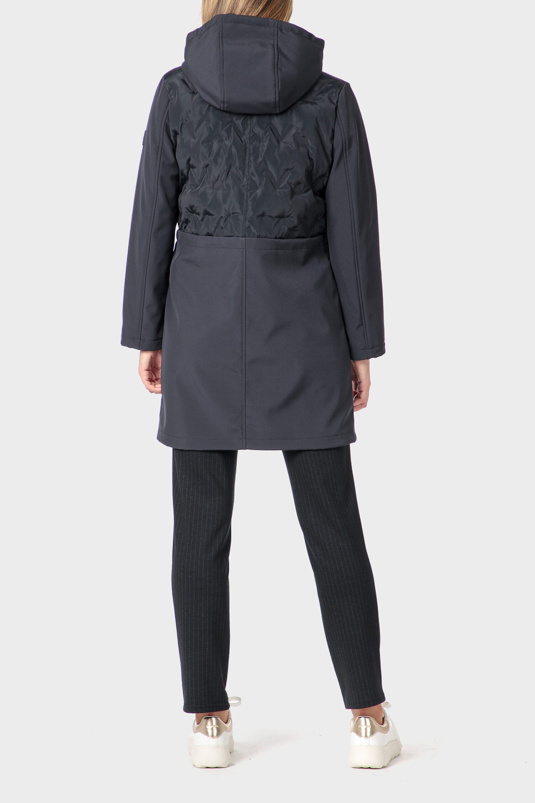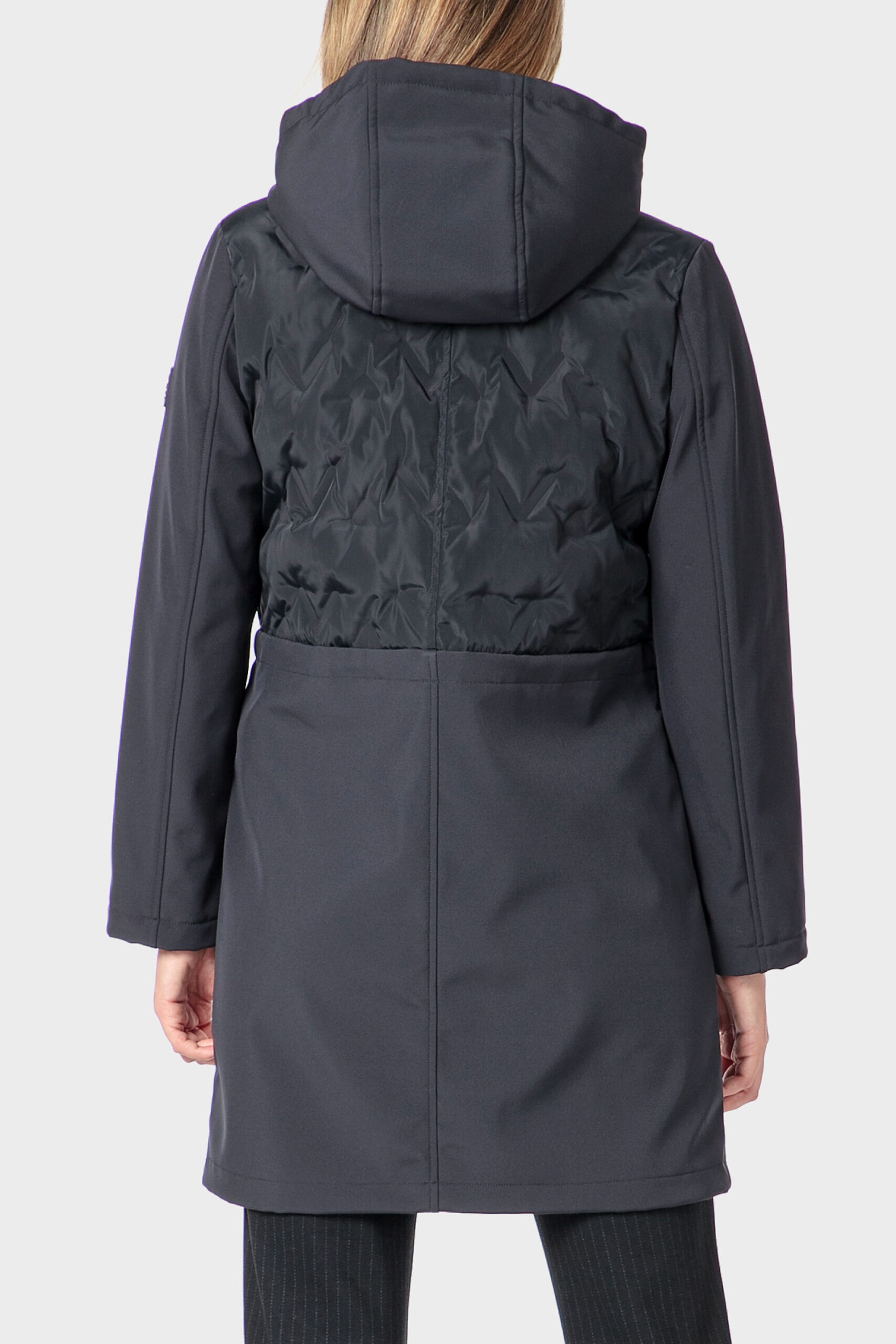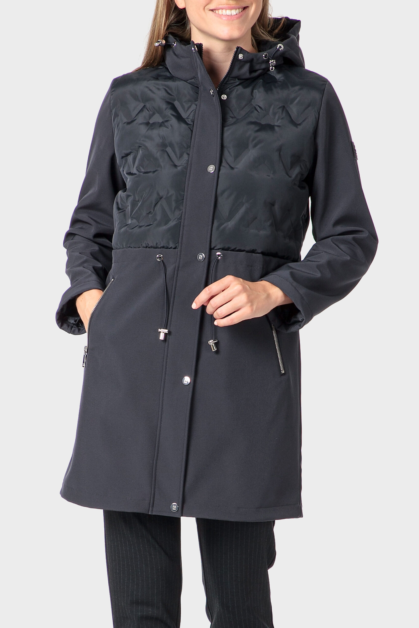 Blue parka long contrasting textures two zippered side pockets hood with adjustable drawstring zipper closing hidden by flap.