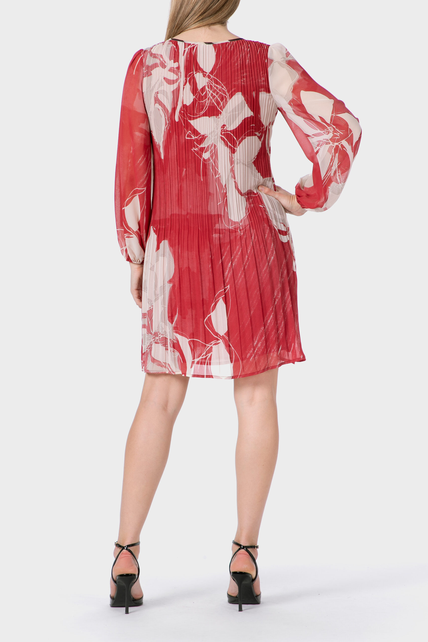 Pleated printed dress neckline in the shape of a tear neck with adjustable drawstring ending in tassels inner lining semi-transparent long sleeves with elastic cuffs.