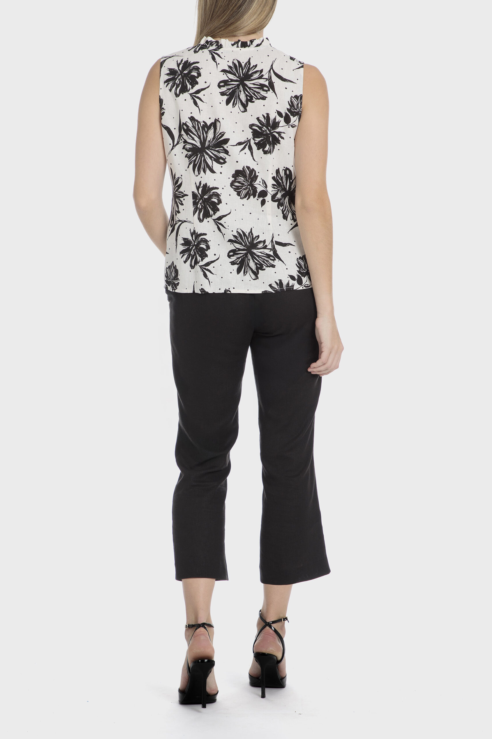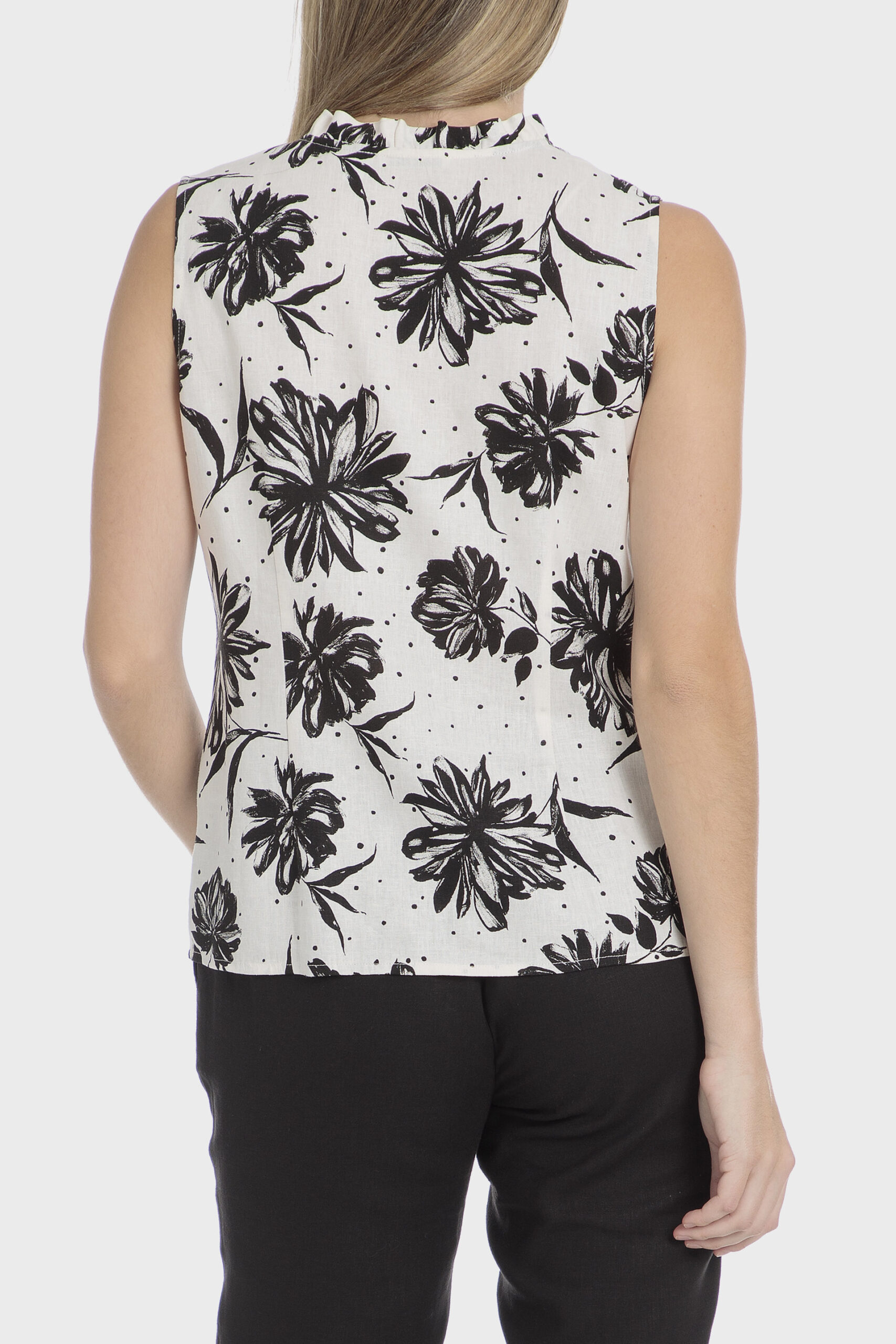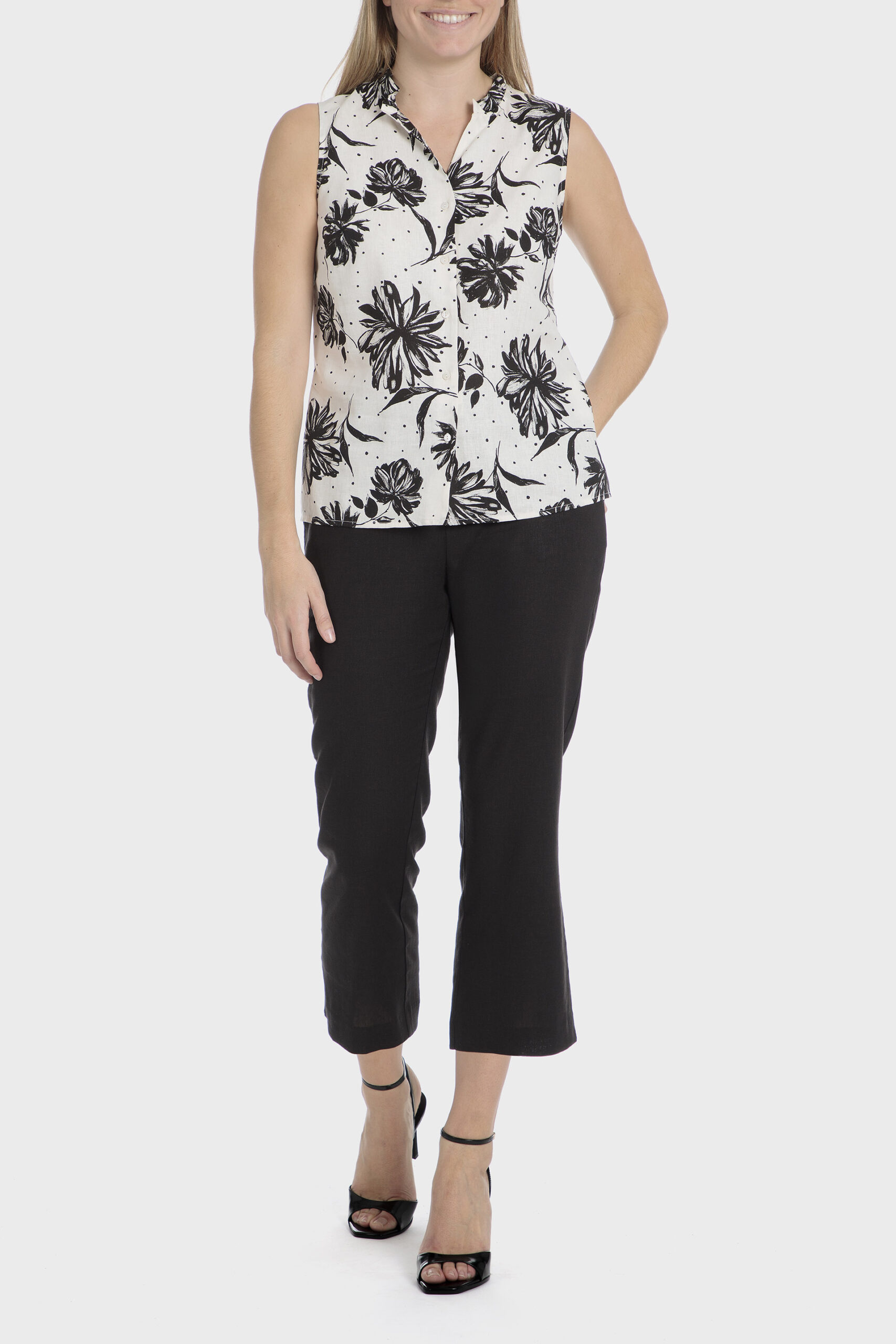 Linen overshirt floral print side slits long sleeves with elastic cuffs front buttoned closing.