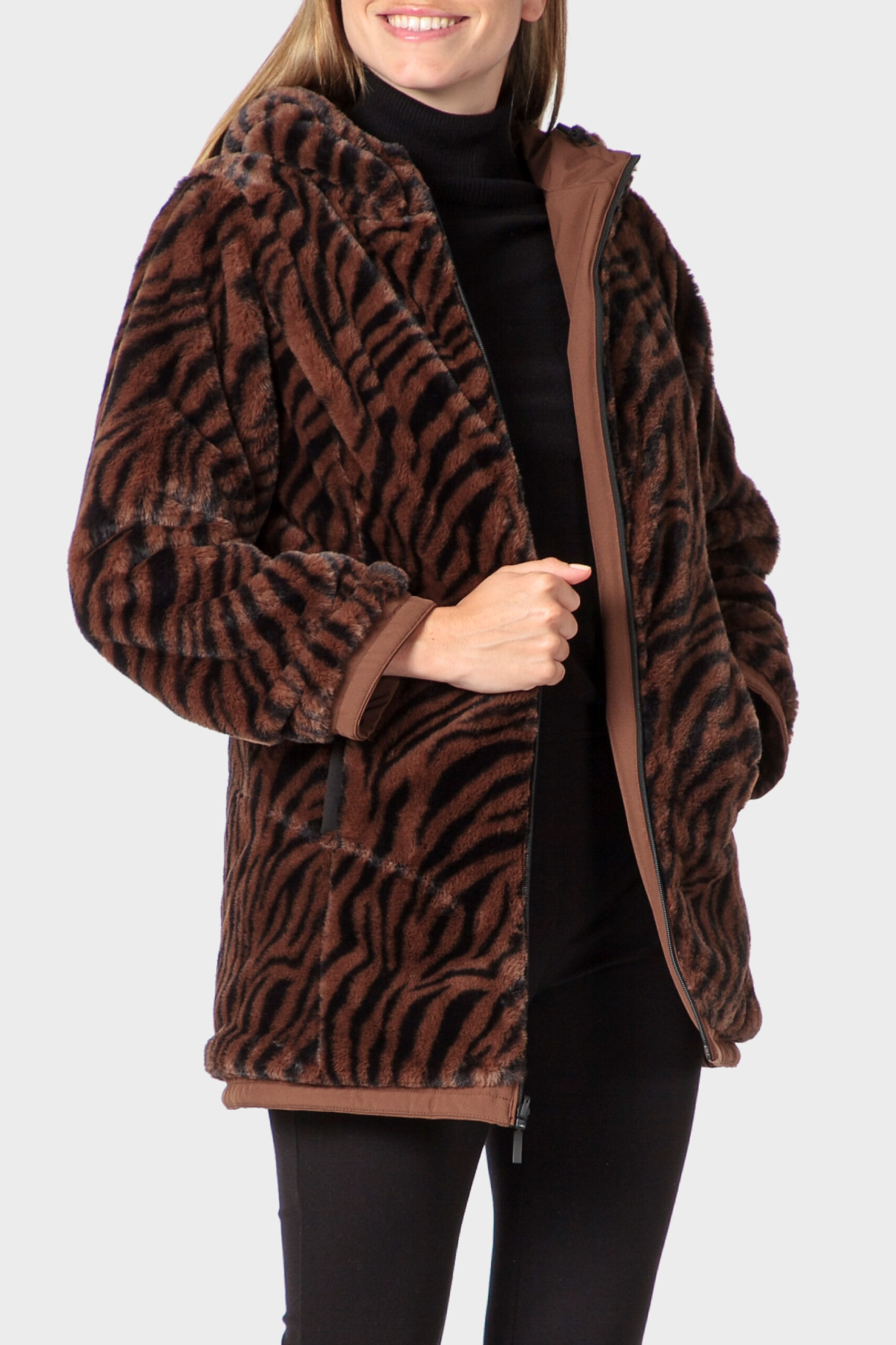 Reversible Brown parka fur effect two side pockets hood with adjustable drawstring front zipper closing.