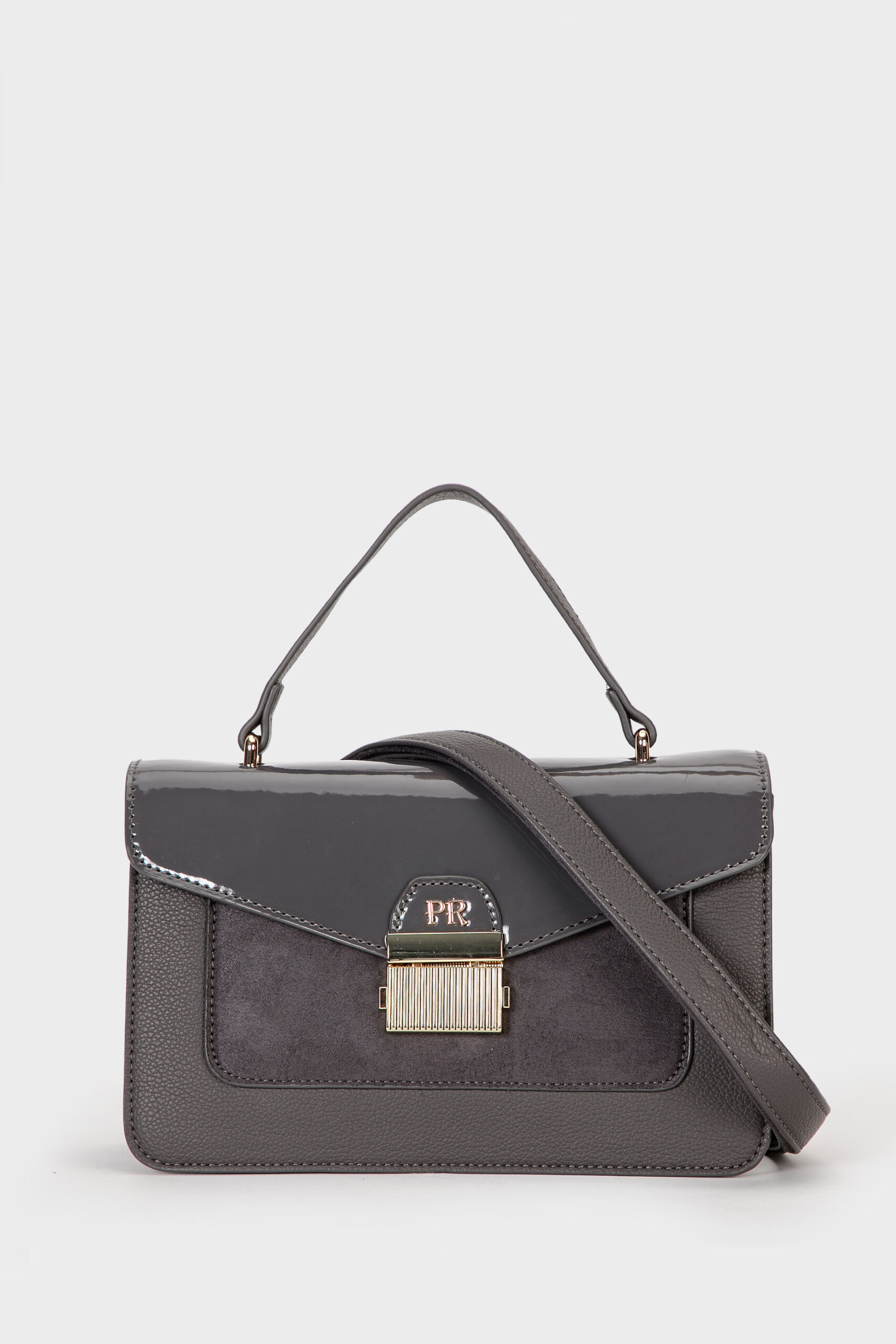 Grey shoulder bag contrasting textures two compartments an outer pocket zipper closing hidden by flap short handle removable and adjustable shoulder strap.